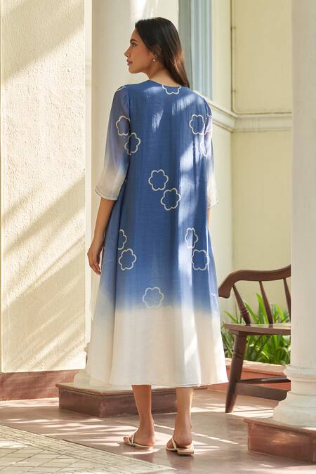 Blue Muslin, Cotton Embroidery Open , Round Ocean Jacket With Dress