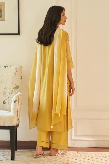 Yellow muslin cotton kurta featuring thread work and a keyhole neckline. Paired with matching pant and dupatta.