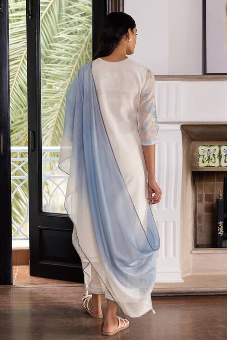 Pearl muslin cotton kurta with floral pattern & contrast intricate thread embroidery. Paired with pleated bordered straight fit pant & ombre dupatta.