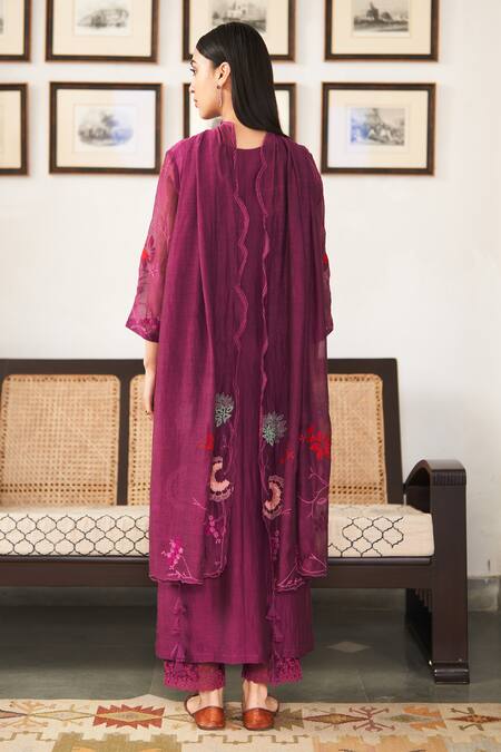 Purple Muslin Embroidery Round Neck Thread And Applique Work Kurta Pant Set