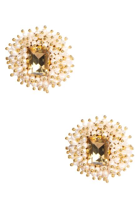 Gold stud earrings featuring a cluster of pearls and beads with a central stone