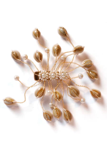 Gold hair accessory featuring shells, beads, and pearls with thread hand embroidery