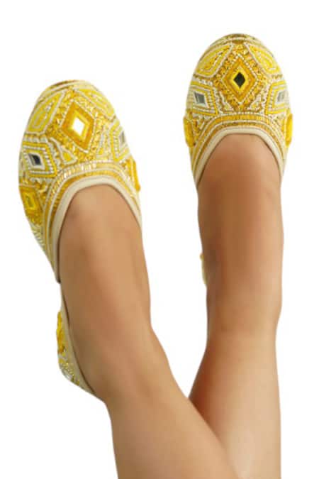 Yellow jutti featuring intricate embellishments with pearls and metal beads