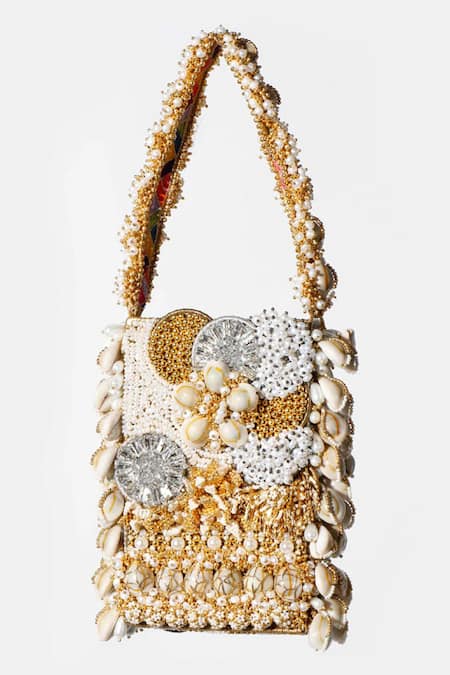 Beige designer handbag crafted with pearls, stones, shells, and brass metal