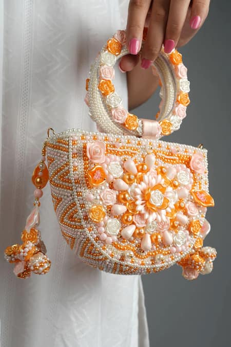 Intricate floral beadwork, Unique circular handle, Tassel accents on sides