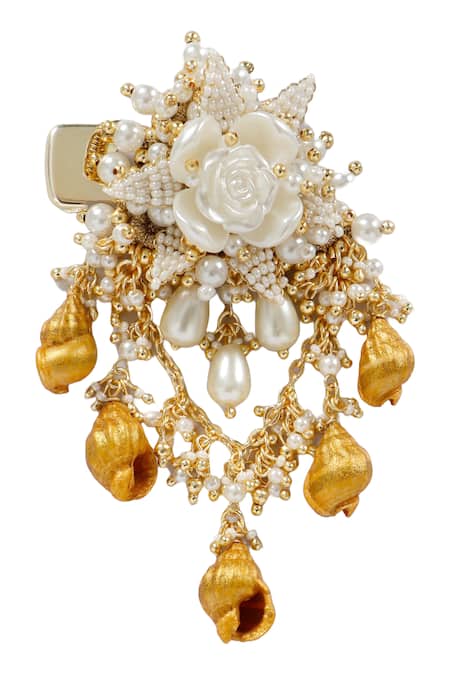 Gold finish floral embroidered hair clip featuring beaded accents and pearl danglers