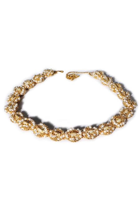 Gold belt featuring hand embroidery with golden metal beads and woven pearls on 20 circular frames
