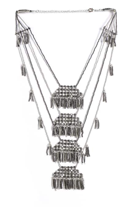 Grey handwoven crochet layered necklace featuring metal beads and tassel accents