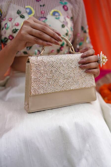 Beige faux leather clutch featuring pearl and bead embellishments