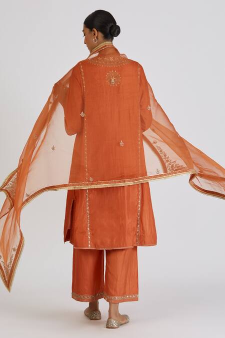 Orange rust dupatta in a sheer organza base with zardozi motifs on the edges and kiran along the borders.