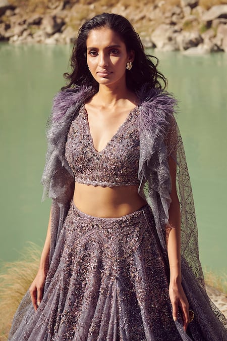 Grey-ish blue shimmer tulle lehenga with cut-dana, French sequins & Swarovski embroidery. Paired with embroidered blouse & cape embellished with feathers.