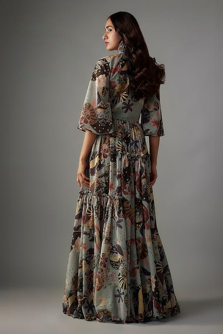 Grey lehenga featuring all over botanic fleur print with ruffled tiers detailing. Paired with a matching print blouse with lantern sleeves and front tie-up detailing.