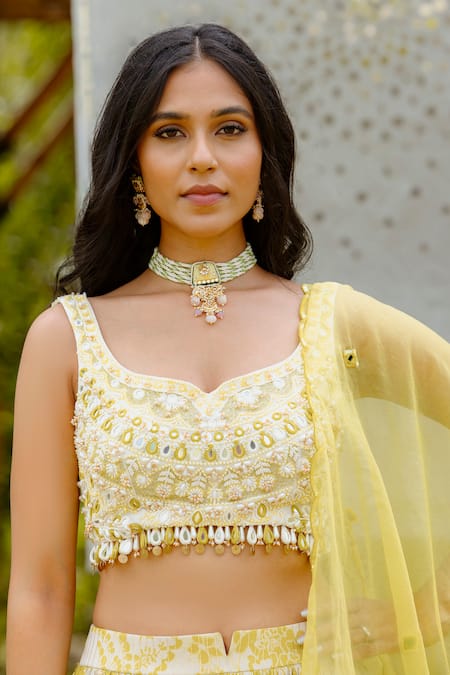 Yellow gathered pleated flare lehenga with all over lily garden print & glittery stripe detailing. Paired with a sweetheart neck blouse featuring flora pearls, sequin & mirror work, along with a complementing dupatta.