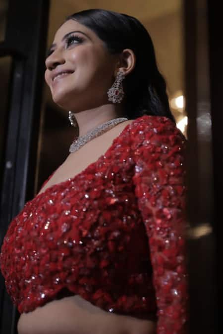 Red lehenga featuring all-over rafflesia garden embroidery with tonal sequins, beads, and cut dana highlights. Paired with a scoop neck padded blouse and embellished net dupatta.