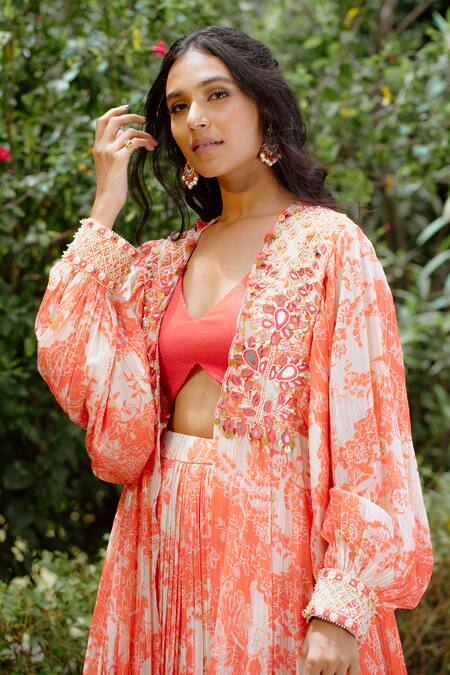 Red lehenga set featuring a sleeveless bustier and an open cape jacket with voluminous sleeves. The jacket showcases all-over floral print with sequin, mirror, and pearl embroidery.