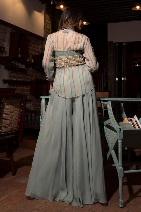 Grey shirt featuring a stripe print with front button detailing. Paired with a geometric embellished bustier and flared palazzo pants.