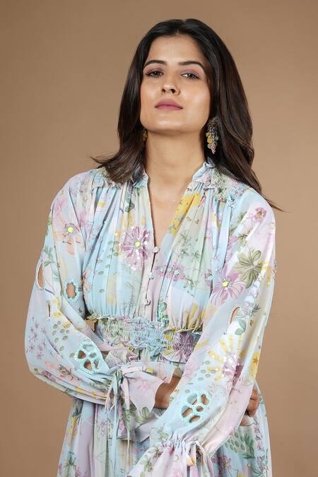 Buy_Vana Ethnics_Blue Viscose Sequins, Cut Work V-neck Vintage Botanical Print Gathered Dress _Online_at_Aza_Fashions