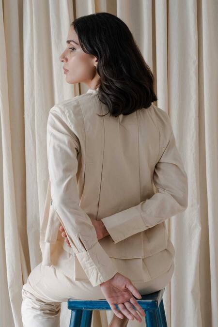 Beige A-line shirt featuring lotus motif embroidery, stand collar neckline, and full sleeves