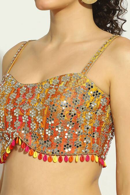 Crystal drops on blouse hem, Side tassel tie-up, Ruffle detailing on dupatta