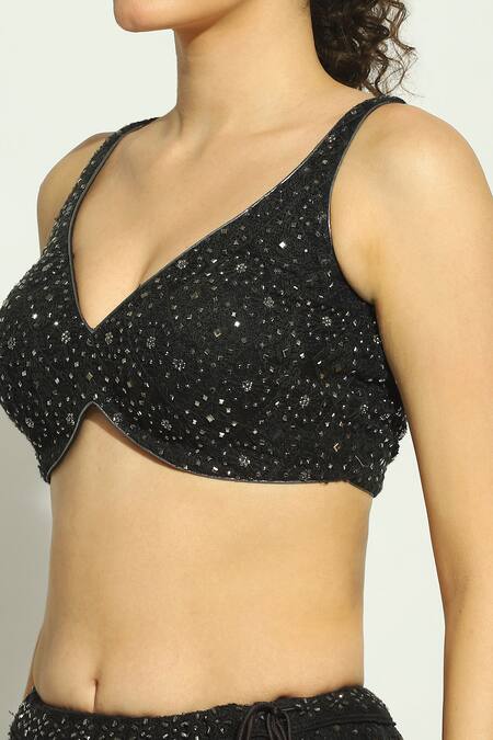 Black Net Embroidery, Smocking, Stones Plunge Chikankari Work Lehenga Blouse Set