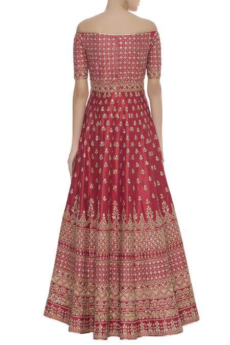 Red off-shoulder anarkali with all-over gota patti work. Comes with embellished dupatta.