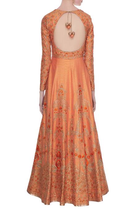 Peach anarkali with all-over floral motif work. Comes with scallop border dupatta.