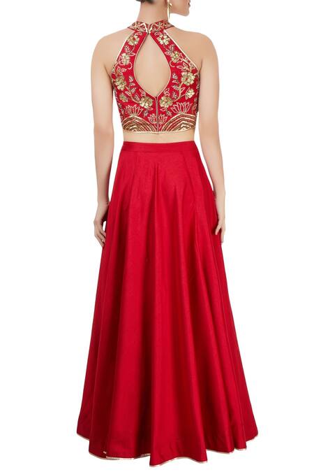 Red Soft Silk Sequin Halter Neck Embroidered Blouse And Lehenga Set