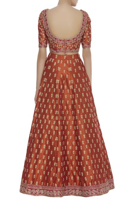 Orange lehenga with all-over floral motif work. Comes with embellished blouse & dupatta.