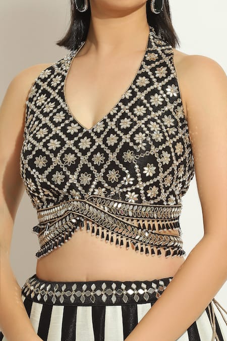 Black Silk Mirrors Halter Neck Embroidered Blouse Lehenga Set