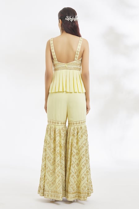 Yellow georgette peplum top featuring sweetheart neckline and gota patti & mirror work embroidery. Paired with an embroidered gharara and ruffle dupatta.