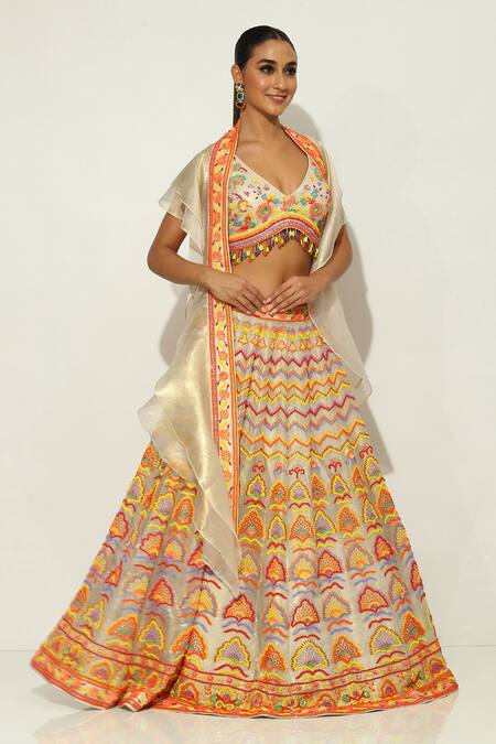 Ivory lehenga featuring multicolour floral and chevron bead sequin embellished motifs on a shimmer base. Paired with a padded bead embellished tasselled blouse and a ruffle dupatta.