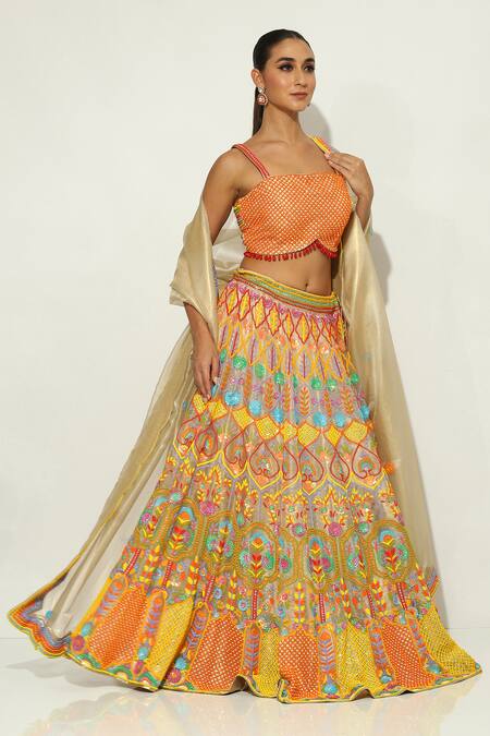 Multicolor lehenga featuring floral embroidery with sequins, threads, and beads. Paired with a padded blouse and a scallop embroidered border dupatta.