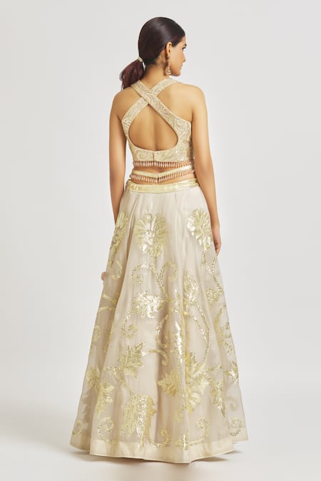 Padded blouse with criss cross back, Scallop embroidered borders on dupatta, Attached cancan for added volume