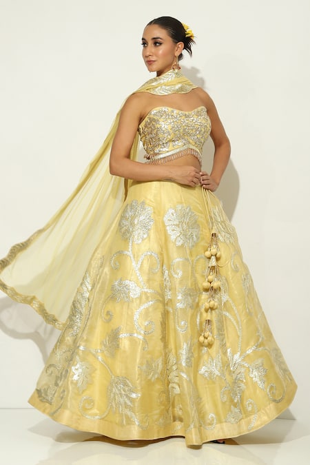 Yellow Organza Tassels, Gota Patti Sweetheart Floral Embroidered Lehenga Set