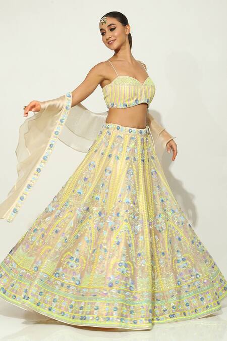 Ivory lehenga adorned with multicolour floral vine bead and sequin embellishments on a shimmer organza base. Paired with a padded bead-embellished blouse and a ruffle dupatta.