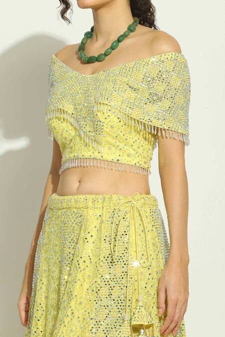 Yellow lehenga featuring chikankari and Swarovski embroidery in geometric patterns. Paired with an off-shoulder embroidered padded blouse and a sheer dupatta with border embroidery.