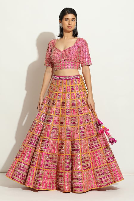 Multi-colored dupion silk lehenga featuring gota patti and mirror embroidery. Paired with a padded blouse and a dupatta with a leaf neck and half sleeves.