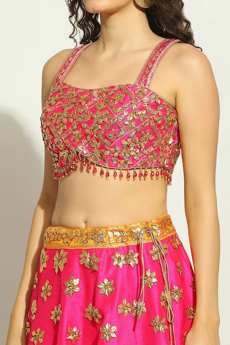 Fuchsia lehenga featuring gota embroidery with floral patterns and a drawstring closure. Paired with a spaghetti padded blouse and a scallop border embroidered dupatta.