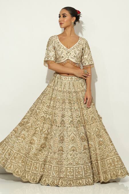 Ivory Silk Tassels, Beads, Embroidery Bandeau Gul Zardozi Bridal Lehenga Set