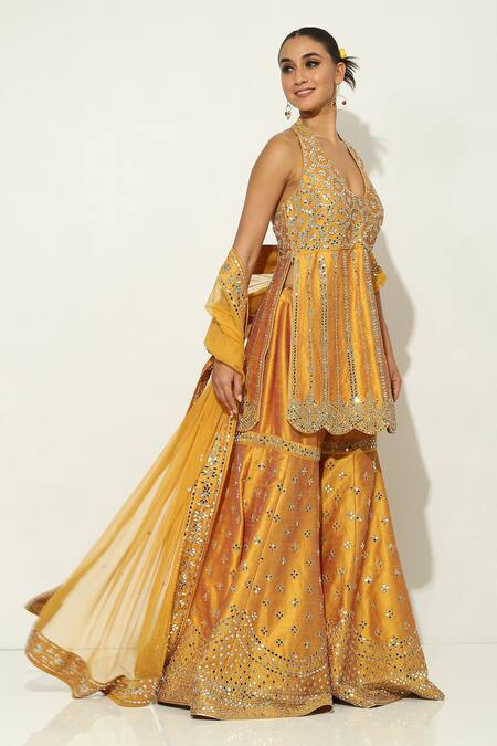 Yellow halter neck padded kurta featuring mirrorwork embellished floral motifs, side slits, and scalloped borders. Paired with an embellished sharara and dupatta.