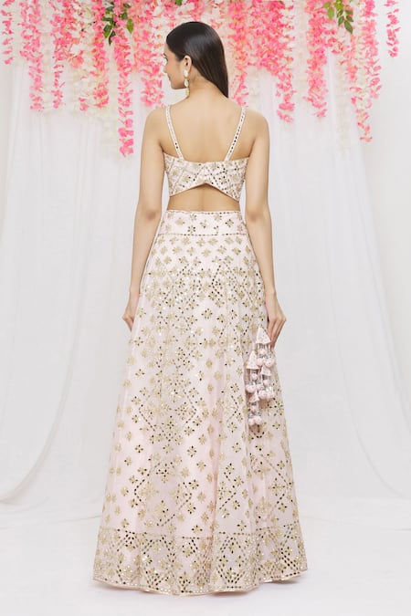 Powder pink lehenga with mirror, zari embroidery. Paired with blouse & dupatta.