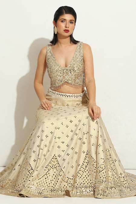 Ivory lehenga featuring all-over mirrorwork with scalloped patterns. Accompanied by a padded crystal tasselled blouse and an embroidered dupatta.