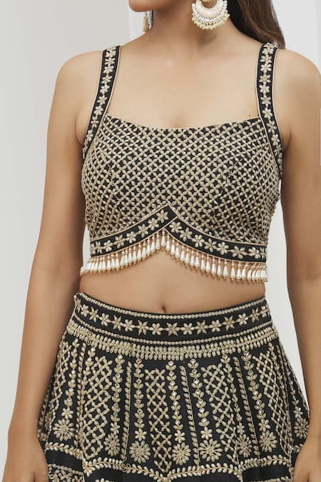 Black Silk Pearls Square Neck Embellished Lehenga Set