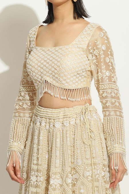 Ivory lehenga featuring all-over pearl embroidered floral jaal and scallop patterns. Paired with a padded pearl tasselled blouse and an embroidered dupatta.