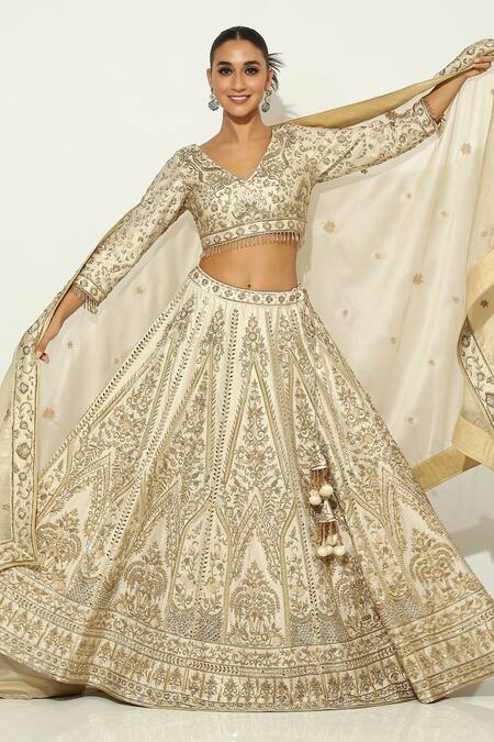 Ivory lehenga featuring oriental zardosi embroidery with an attached cancan. Paired with an embroidered padded blouse and matching dupatta.