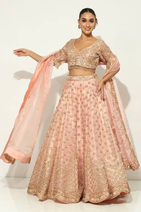 Pink lehenga featuring floral zardosi embroidery and attached cancan. Paired with a checkered floral embroidered padded blouse and embroidered dupatta.
