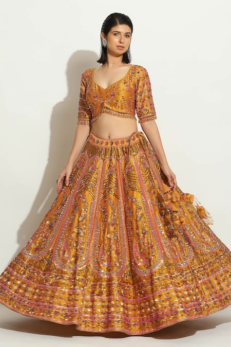 Yellow lehenga featuring intricate zardosi and thread embroidery. Accompanied by a padded blouse and a dupatta with embellishments.