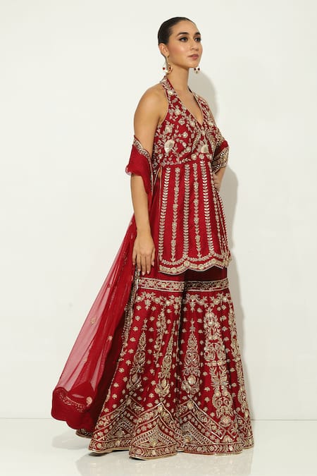 Wine halter neck kurta featuring zardozi embroidered floral motifs embellished with sequins and scalloped borders. Paired with an embellished sharara and matching dupatta.