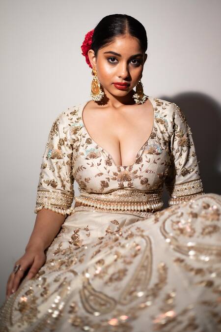 Ivory lehenga featuring intricate zardozi and pearl embroidery with paisley and floral patterns. Paired with a matching padded blouse and an embroidered dupatta.
