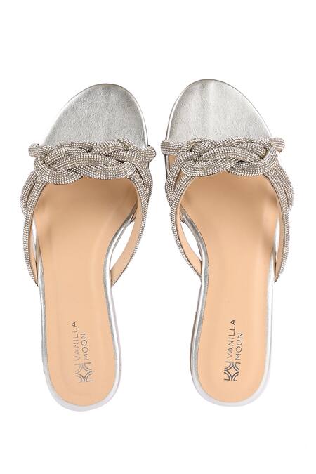 Silver leather flats featuring a knotted strap adorned with diamante studs and a round toe design